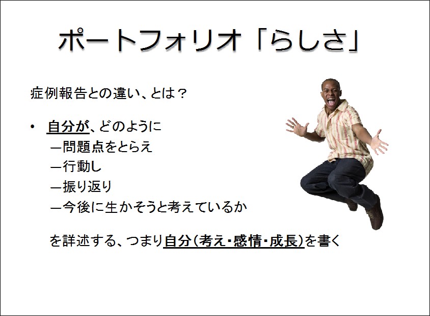 PFには学習者自身の考えや感情の変化、学習項目に焦点を当てて記述するという特徴があり、患者に関する医学的な記述をする症例報告とは全く性質が異なります。
